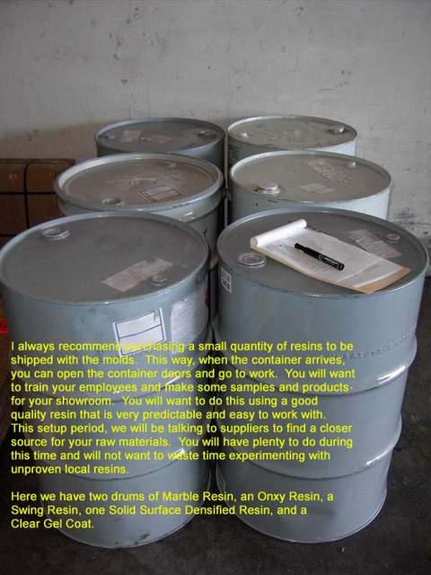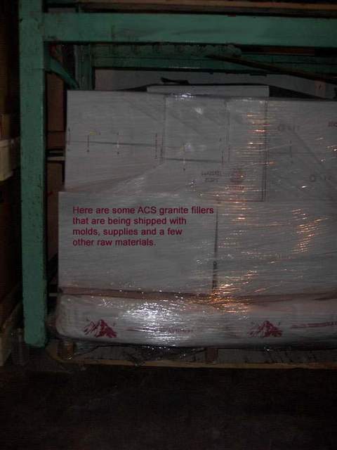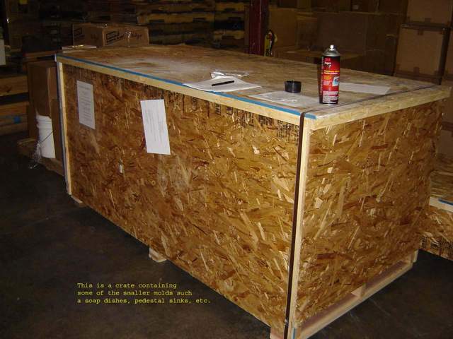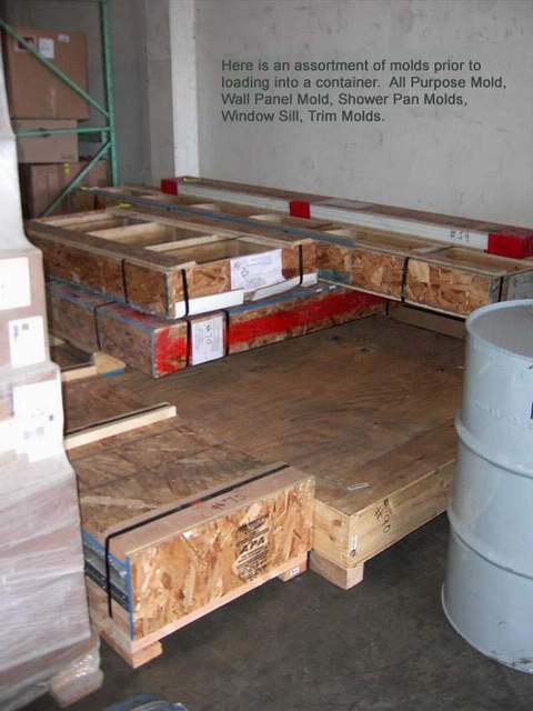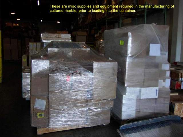 Here are a couple of shipments of cultured marble molds, equipment, and supplies that are being loaded into containers for overseas factories. These particular shipments include some raw materials to expedite setting up the factory and production. It takes about eight weeks to have everything ready to ship. |